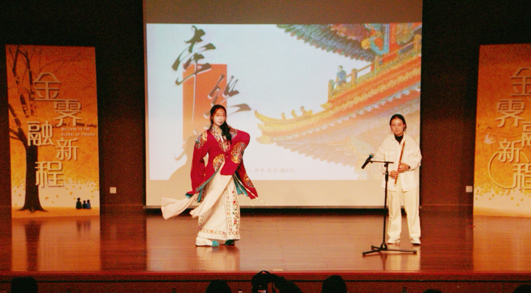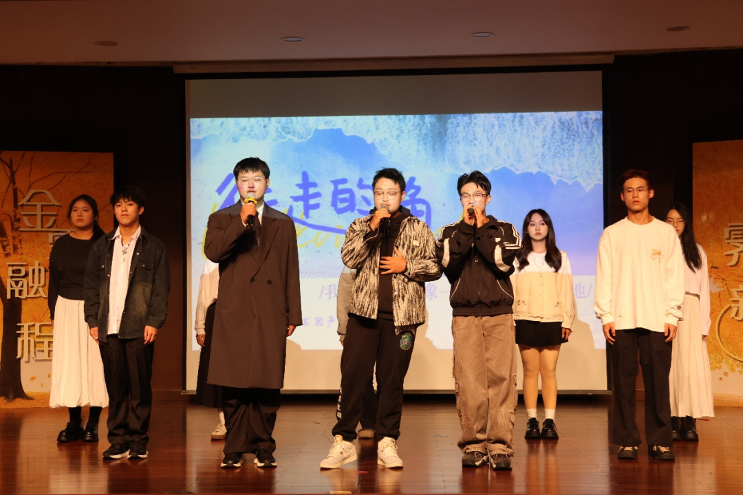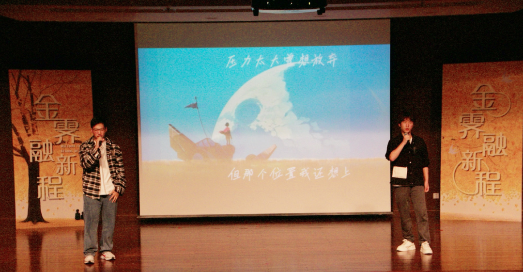你方唱罢我登场,此时会厅中响起的高昂男声轻易铺满整个空间,低沉有力的说唱声随即跟上,共同诠释着他们对这个世界的理解与期待。这是25投资班与25金融2班联袂带来的原创歌曲《新世界》。