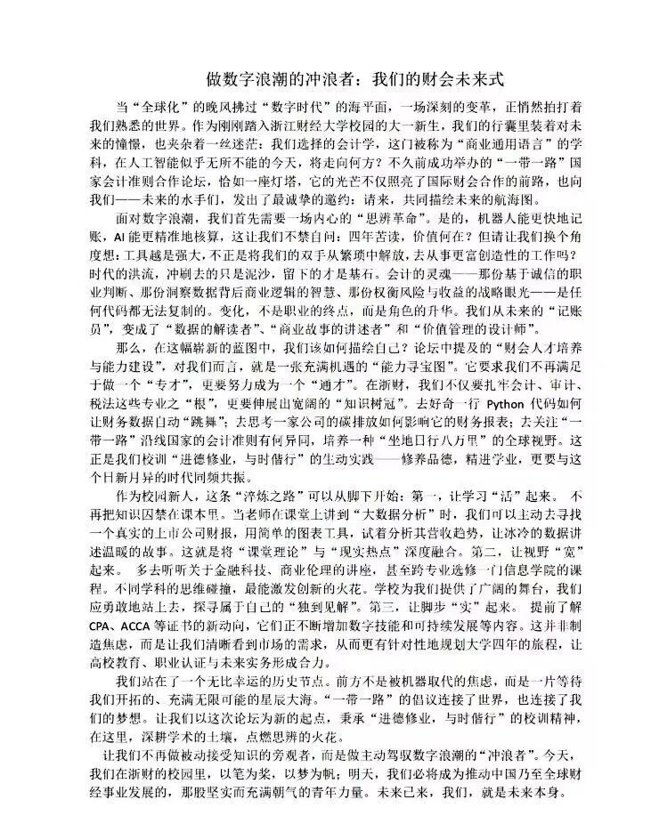 本次思辨赛的成功举办,紧密承接了“一带一路”会计合作论坛的宝贵共识,充分依托我校的财会学科优势与“进德修业,与时偕行”的校训精神,有效引导同学们深耕学术前沿,勇于锐意思辨。活动成功地将课堂理论知识与现实热点议题深度融合,鼓励参赛者从论坛确立的多个维度出发,积极探索,迸发独到见解与思维火花。通过这一平台,同学们的学术分析能力、综合创新精神与国际全球视野得到了显著淬炼与提升,扎实展现了浙财学子为推动未来财经事业发展的青年智慧与蓬勃力量,圆满达成了活动的预期目标。