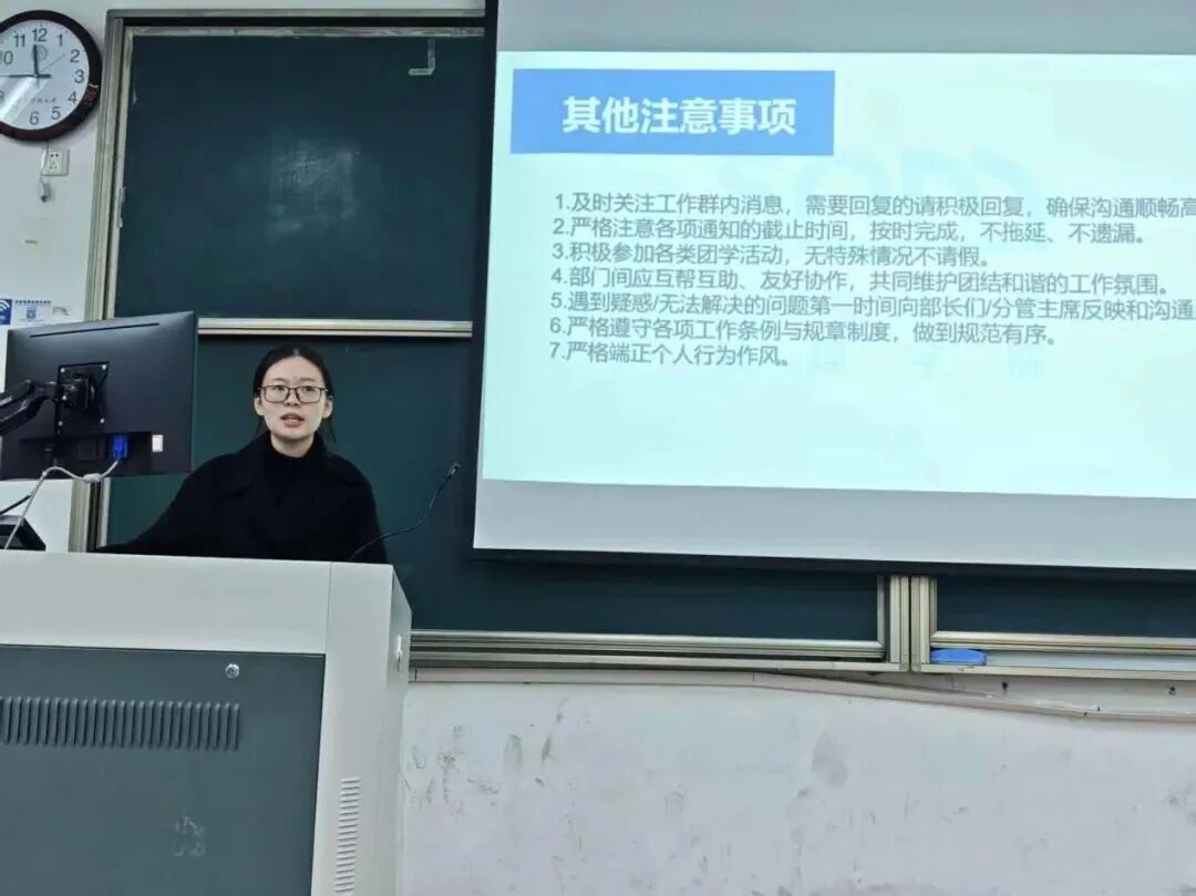 学院干训大会正式拉开帷幕,学生会主席姜雨馨率先登场,先清晰展示团学组织整体架构,再深入解读各部门职能。此外还围绕团学工作,强调多项注意事项,同时详细介绍了报销流程。随后,组织中心负责人黄佳慧通过提前录制的视频,对第二、三课堂分的加分流程进行了细致讲解,让相关规则与操作一目了然。