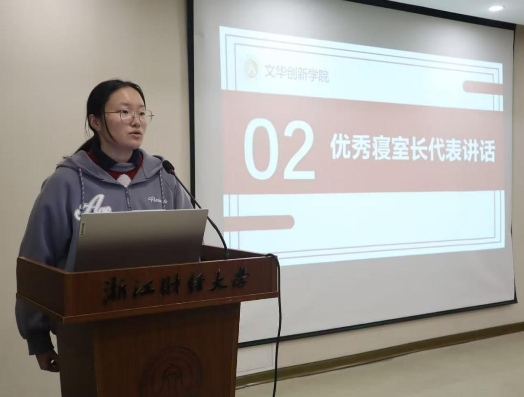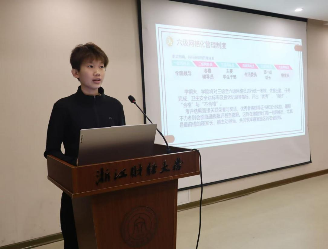 优秀寝室长代表鲁越源上台分享了她的经验,从整个寝室的共同目标出发,内容涵盖寝室卫生保持、寝室成员矛盾化解、学习氛围的积极营造以及集体活动的精心策划,毫无保留地分享了她宝贵的经验。