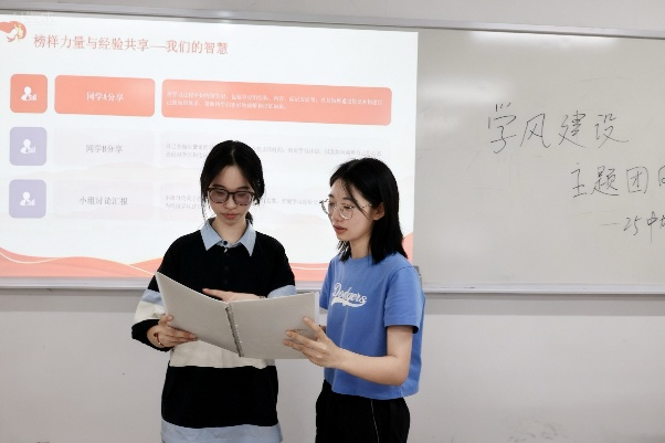活动中,团支书首先通过理论阐述引导同学理解学风内涵,进一步明确学风关键词;借助经验分享推动学习方法的践行,以互动书写启发对学风的深层思考;最后同学们在学风标语横幅上集体签名并合影,凝聚共识、坚定共建优良学风的决心。