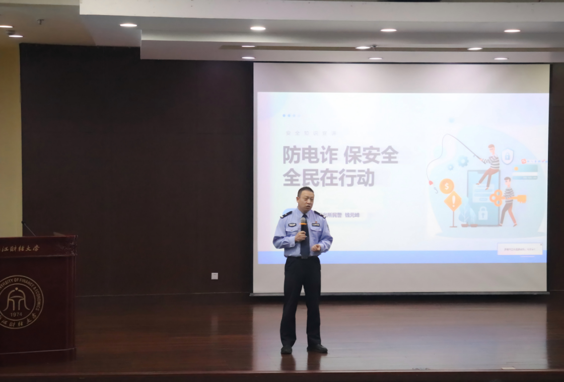 为有效预防针对大学生下手的各类诈骗活动,提高学生的反诈意识,10月19日,经济学院在学术中心第一报告厅开展“防电诈,保安全”专题讲座,邀请白杨街道派出所民警钱元峰主讲,2025级全体新生参与。