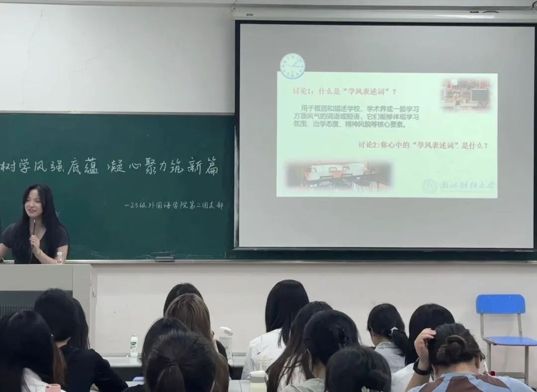 在学风表述词凝练环节,各支部结合专业特色与发展目标展开深入研讨,形成了一系列兼具专业特色与实践导向的表述成果。25外语1团支部提出“融贯中西,语通世界”,彰显跨文化沟通与全球视野;25英语C1团支部凝练为“精学善思,融通致远”,聚焦语言能力与财经素养的融合贯通;25研究生团支部提出“博学笃行,明德至善”,体现研究生阶段的学术追求与品德修养;24日语C1团支部提出“勤学善思,笃行致远”,强调持续学习与实践并重;23英语3团支部倡导“严谨求实,知行合一”,注重学习态度与实践能力的统一等。