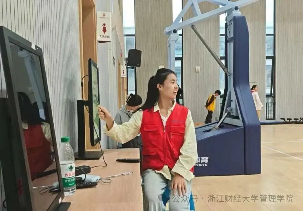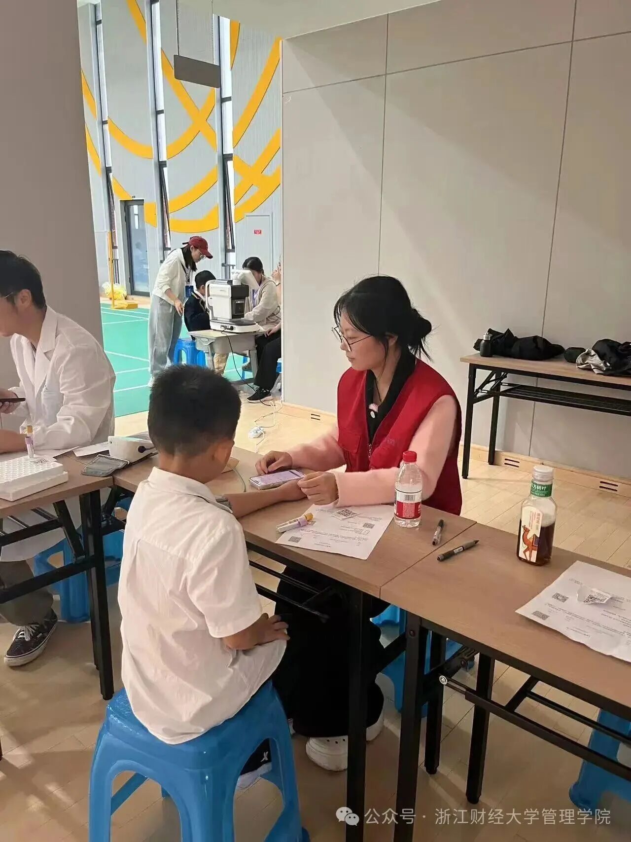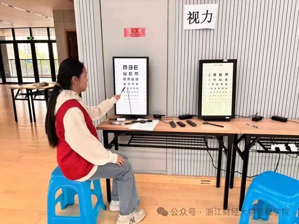 10月21、22日,一群身着红色志愿服的志愿者们在启成实验学校参与了一场为期两天的学生体检活动,用专业与爱心为孩子们的健康成长保驾护航。在视力检测区,孩子们在专人引导下有序排队,流程清晰高效。检测中,志愿者们化身 “护眼老师”,一边用温和的语气指导学生辨认视标,一边细致记录每一位学生的左眼、右眼视力数据;遇到视力偏弱或紧张的孩子,还会蹲下身轻声安抚,用 “多看绿树少看屏幕” 的小提醒传递护眼知识。