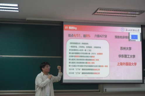 随后,保研至上海外国语大学的何奕铭学长也分享了自己的保研经历,并针对同学们可能面临的三个典型困境提出建议:保研保不到理想院校是否继续坚持、如何权衡学校与城市的选择,以及是否该将整个大学生活全身心投入保研。在互动环节,现场氛围十分热烈,同学们就自己在保研方面的问题踊跃提问,何奕铭学长耐心细致地逐一解答,又结合自己的实际经历,分享了许多宝贵经验。