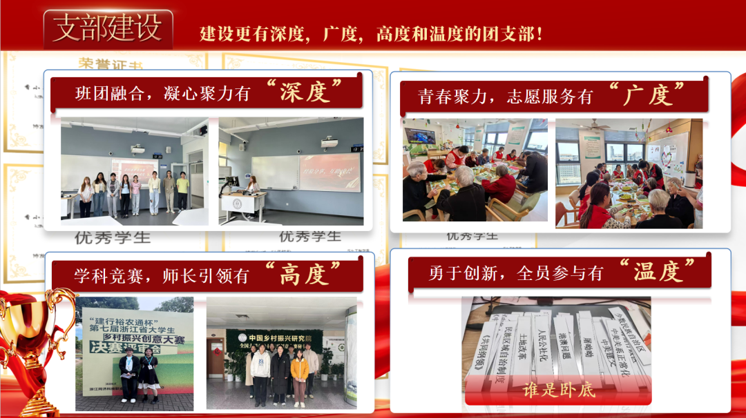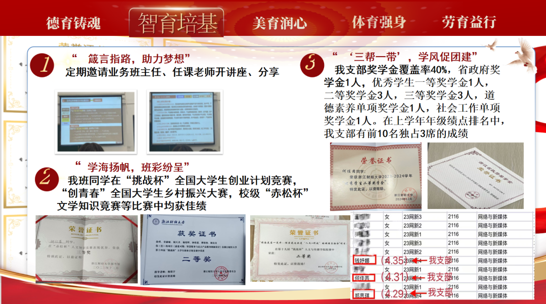 23级网新4班以“青春聚力,青衿逐梦”为翼,“学风铸魂炬成光”为信念。该支部在“挑战杯”“乡村振兴创意大赛”中屡获佳绩,40%奖学金覆盖率、年级绩点前10独占3席,彰显智育硬实力。 德育铸魂,该支部青年大学习参与率与合格率双100%,15名入党积极分子接续初心。美育润心,他们以镜头定格校园美好、传播文化力量。体育强身,排球新生赛第五名、羽毛球锦标赛获奖见证青春活力。劳育益行,累计志愿时长超1000小时,助老服务、光盘打卡践行责任担当。从班团融合的凝心聚力到师长引领的登高望远,这个有深度、有温度、有广度、有高度的集体,正用网新人的创意与坚守书写青春答卷。