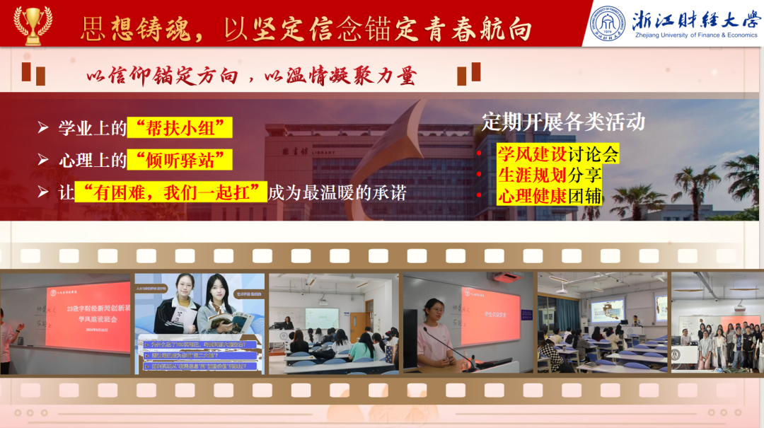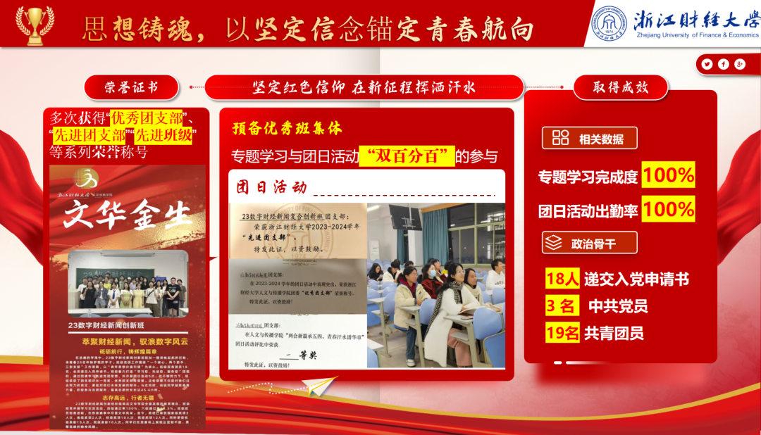 23数字财经新闻班以“洞悉数财,传播万象;声生不息,时代强音”为班魂。作为融合数字、财经与新闻的创新班级,支部将专业特质融入每一处成长细节:思想铸魂上,打造“学习型、先进型、服务型”团支部,“智慧团建”高效运行,青年大学习、团日活动参与率双100%,让红色信念锚定青春航向。学风砺剑时,必修课通过率100%、班级平均绩点4.07、英语六级通过率79.2%,超50%成员斩获校级以上奖学金,用硬核实力锻造数财新闻专业英才。实践担当里,该支部成员依托专业优势参与“新浙商百人”等国家级竞赛、投身科研项目与专利申报,累计志愿时长超550小时,在知行相济中践行青年责任。