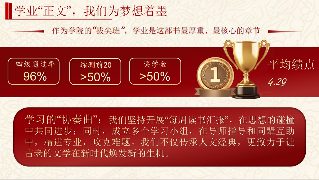 23文学3班作为满载人文底蕴的集体,该支部以制度为基,智慧团建100%线上精准管理,“三会两制一课”落地生根,更斩获学院“优秀团支部”等多项荣誉。同时,该支部以实践为翼,走进省博、校史馆开展“行走的团课”,让理论学习触及灵魂;以奉献为责,累计志愿时长超250小时,人均15+小时的坚守彰显青年担当。学业上,50%的成员斩获奖学金,省级、校级奖项纷至沓来;建设中,100%入党积极分子率、“学霸讲堂”结对帮扶,让先进性看得见、摸得着。笔墨书青春,团心向未来!这个有纪律、有温度、有作为的集体,正以汉语言文学专业的底蕴与活力,在答辩舞台上书写青春答卷。