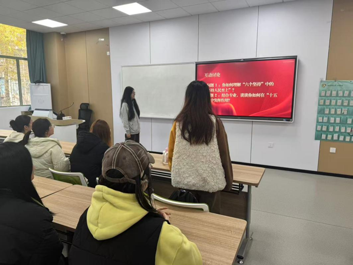活动中,同学们进一步了解了十五五规划的具体内容,深入体会二十届四中全会的精神与内涵。在互动讨论环节,同学们积极探讨,踊跃发言,分享了自己对“六个坚持”的理解以及作为新时代青年应肩负哪些责任的看法。