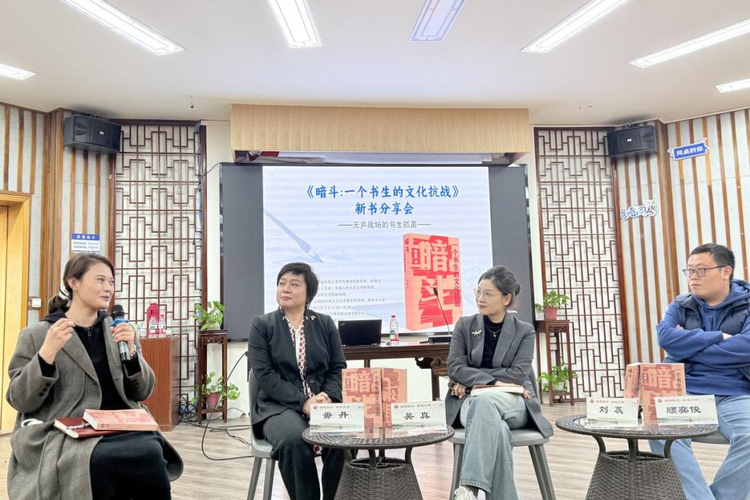 12月11日下午,“无声战场的书生孤勇:《暗斗:一个书生的文化抗战》”新书分享会在问津书院成功举行。本次活动特邀本书作者、中国人民大学文学院教授吴真,上海大学人文学院副教授刘蕊,浙江财经大学人文与传播学院教师、青年评论家顾奕俊担任嘉宾,由人文与传播学院副院长毋丹主持,共八十余名师生参与此次活动。
