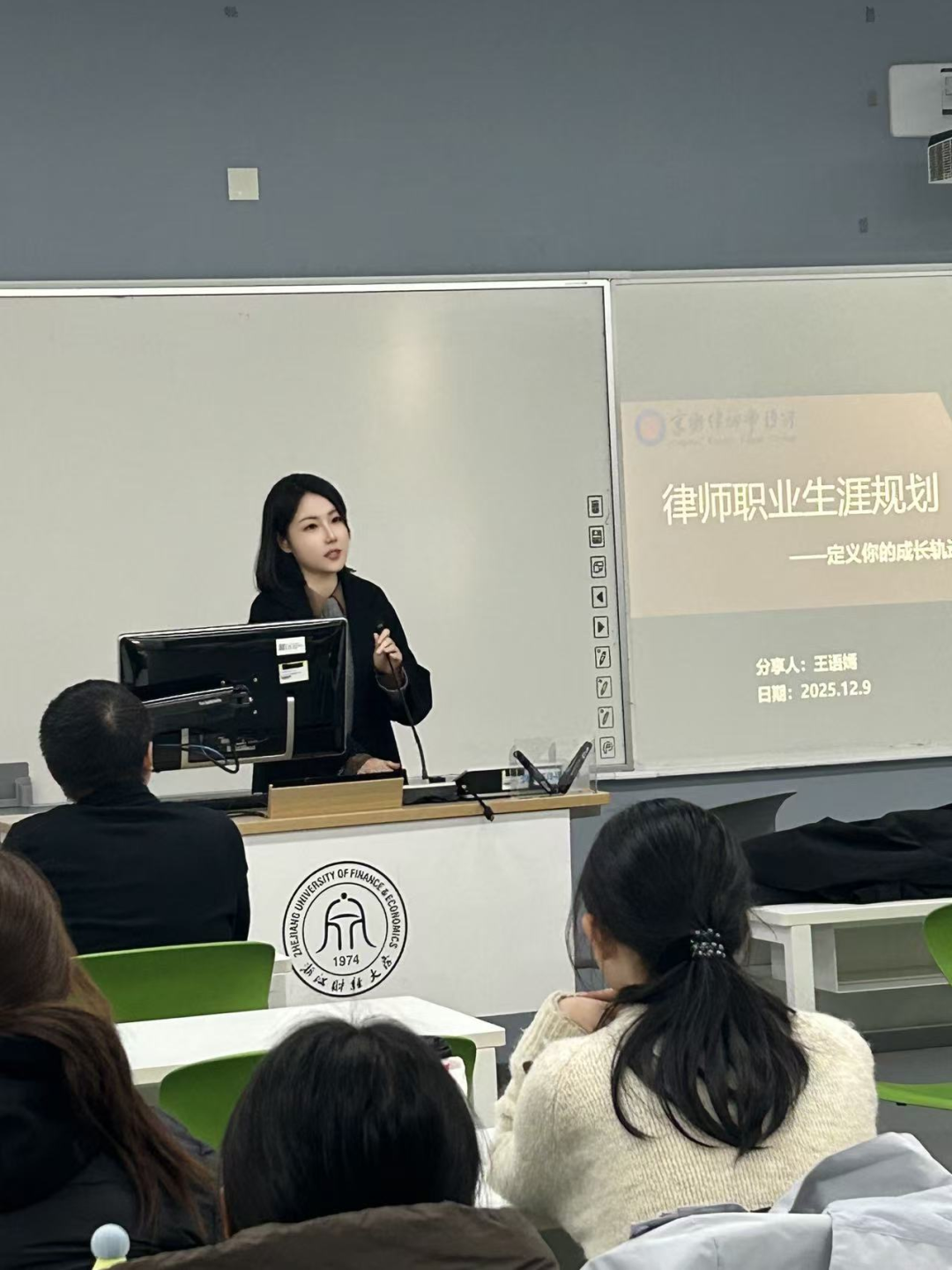 2025年12月9日下午,我院25MAQ班第一期“笃行职业规划讲座”在A108教室顺利举行。本次活动由该班班主任钱炜江老师主持,并邀请浙江京衡律师事务所高级合伙人王语嫣律师担任主讲。