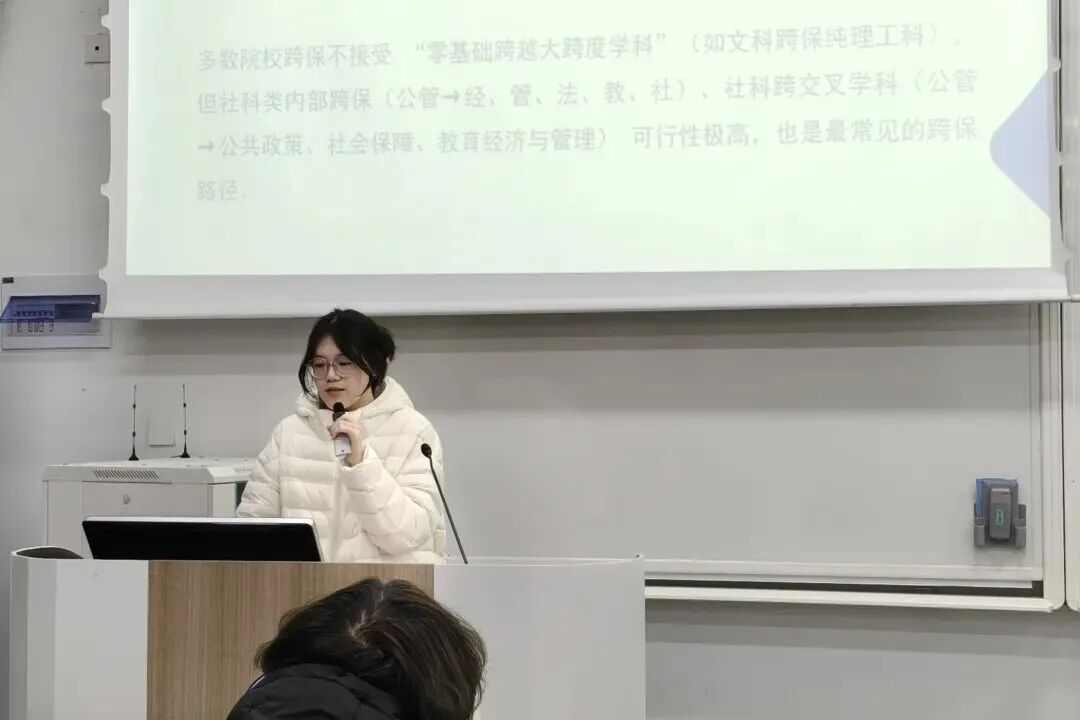 保研至苏州大学的江静雅为同学们解读了我校保研政策,向同学们分享了绩点提升、科研竞赛与保研的衔接技巧,并讲解了如何通过实践经历为保研简历加分,紧接着她从夏令营、预推免、正式推免三个阶段讲解了保研全流程,并分享了个人经验,让在场学子深受启发。