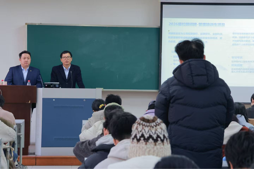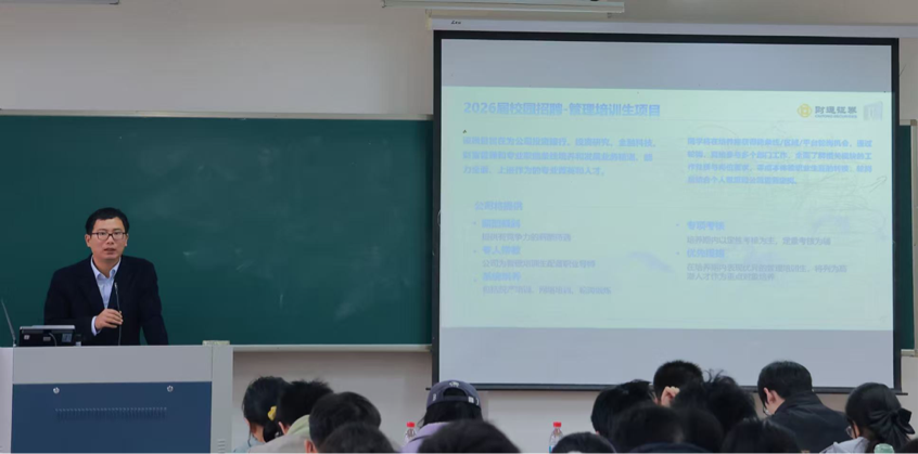 在接下来的环节中,讲师陈烽系统解读了公司文化、校招标准及人才培养体系,让同学们对证券行业的职业蓝图有了更生动的理解。在问答环节中,人力资源负责人结合公司具体的轮岗机制与行业新兴的人才需求趋势,为同学们逐一答疑解惑,鼓励大家在校期间扎实专业基础。