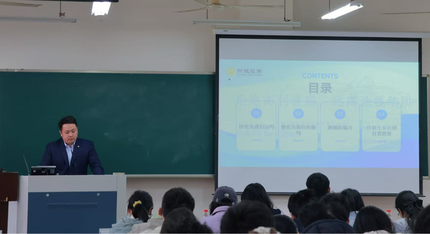 在投教讲座环节,财通证券讲师陈烽聚焦金融安全与风险防范,以 “投资离我们远吗”“炒股真能轻松赚吗”“测测防骗力”“终极生存法则——自我投资” 四大板块为核心,层层深入,系统构建了金融风险认知体系。