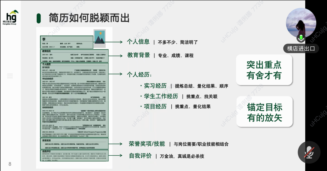 近日,外国语学院职业规划训练营求职专场——“决胜春招:如何在简历和面试中脱颖而出”为主题的讲座成功举行。浙江横店进出口有限公司招聘经理、校园招聘负责人张锴作为特邀嘉宾,为近百名学生带来了一节职业规划干货课,2026届毕业生通过“云直播”线上参与。