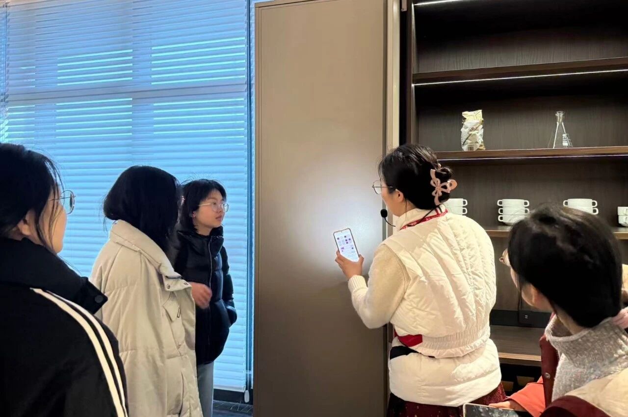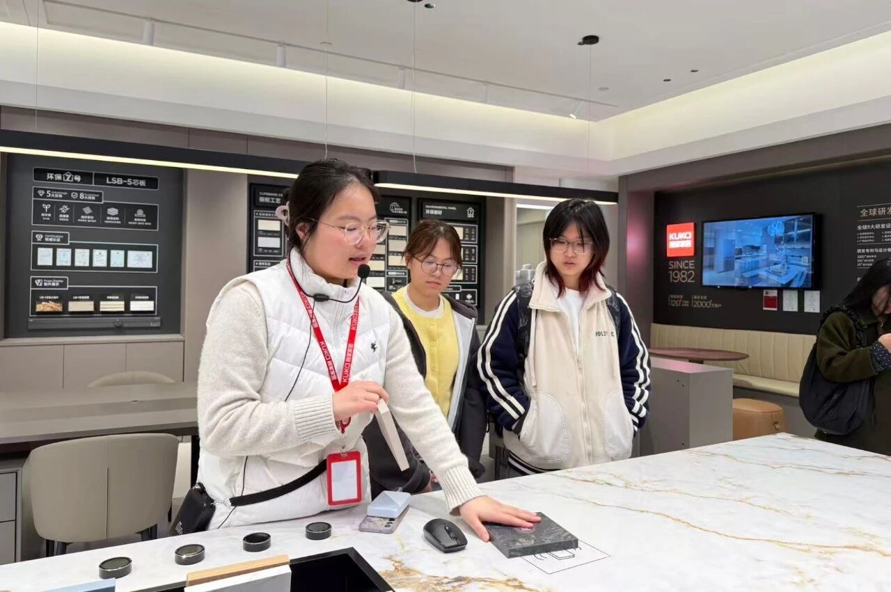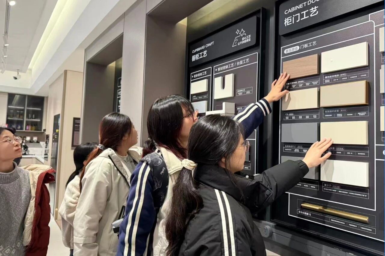 在企业相关负责人的带领下,师生一行首先走进品牌文化展厅。工作人员详细讲解企业发展历程,展示从传统手工制作到智能化生产的转型之路,让大家深刻感受品牌匠心与创新精神。展厅内风格多样的家居设计作品,生动诠释“以用户需求为核心”的设计理念,使同学们直观体会设计与生活、产业与市场的深度融合。