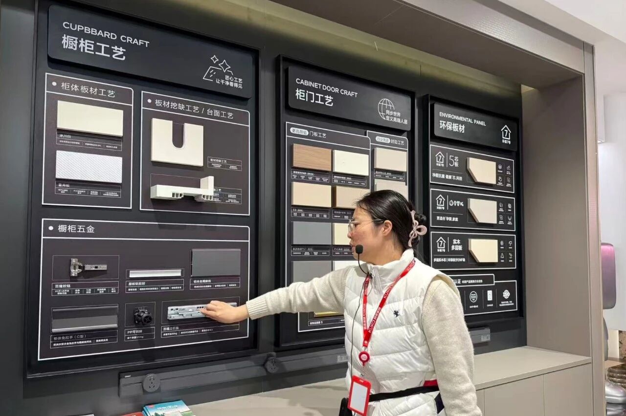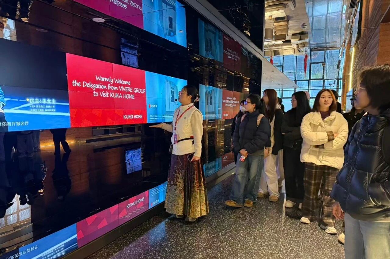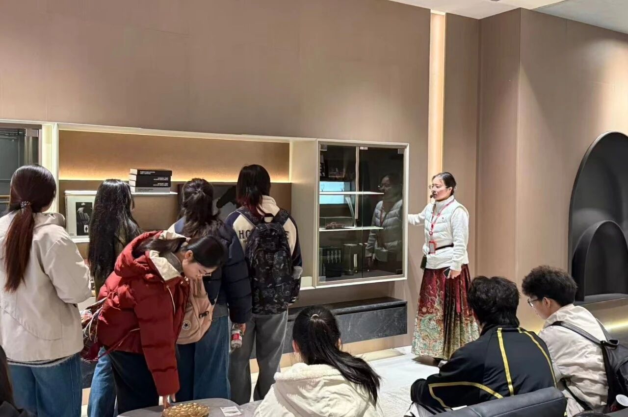 在企业相关负责人的带领下,师生一行首先走进品牌文化展厅。工作人员详细讲解企业发展历程,展示从传统手工制作到智能化生产的转型之路,让大家深刻感受品牌匠心与创新精神。展厅内风格多样的家居设计作品,生动诠释“以用户需求为核心”的设计理念,使同学们直观体会设计与生活、产业与市场的深度融合。